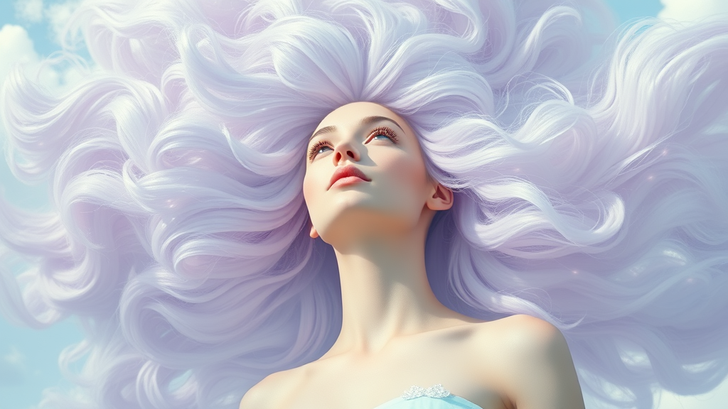 Fantasy sky empress with ethereal hair of swirling clouds photorealistic style natural lighting encased in gentle hues of baby purple and mint full body macro perspective embracing softness of pastel tones with subtle white accents radiant skin enhanced by depth of field ethereal elegance --ar 1:2 --v 4 --stylize 1000
