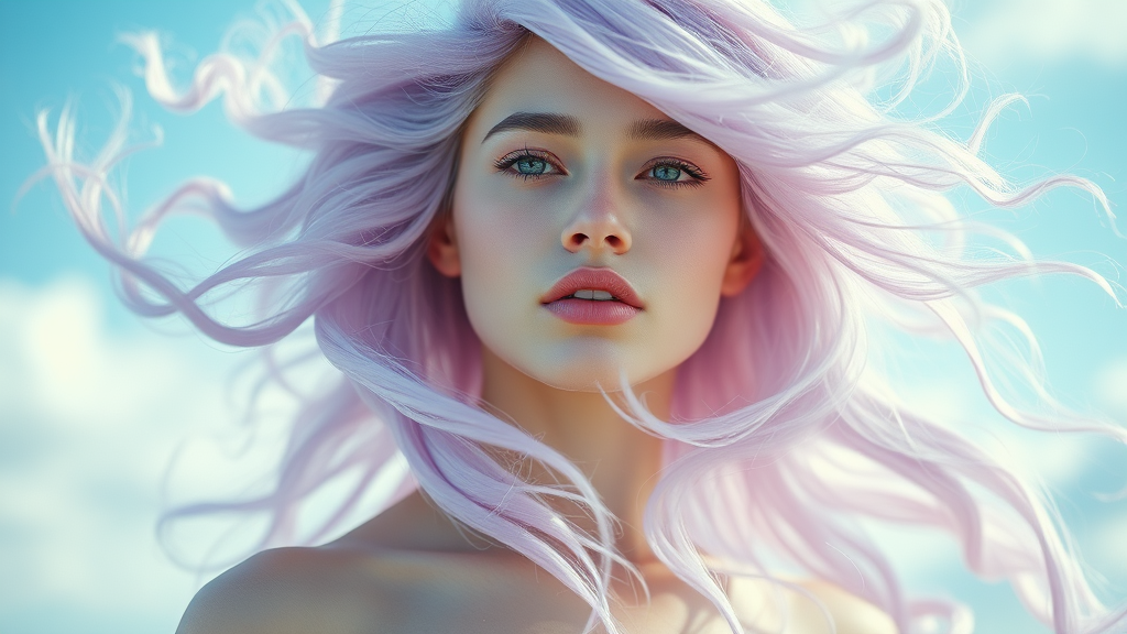 Fantasy sky empress with flowing cloud-like hair, photorealistic, captured in natural lighting with a macro lens; her ethereal essence highlighted by soft baby purple and mint hues. A full body portrayal in pastel tones, with a delicate play of white and skin colors, creating a dreamy aesthetic with an artistic depth of field.