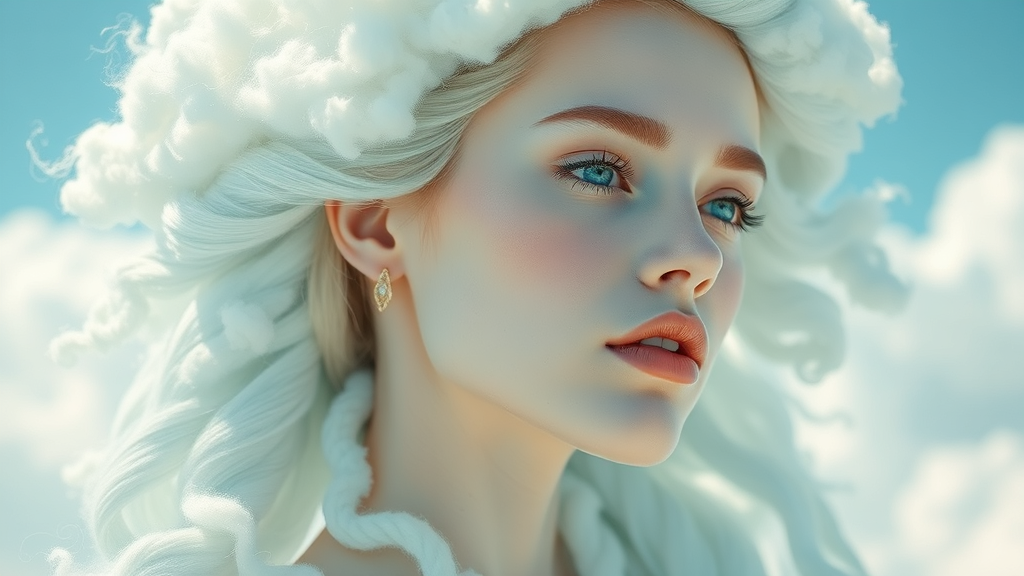 Fantasy sky queen, clouds woven into her hair, photorealistic essence, bathed in natural light, captured through a macro lens influence of Gerald Brom; a palette of baby blue and mint, pastel hues melding with pure white, flawless skin contrasting the ethereal atmosphere, depth of field capturing the delicate details, aspect ratio 1:2, stylization at peak, an ethereal blend of serenity and regality.