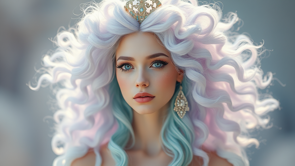 Fantasy sovereign of the skies adorned with ethereal hair resembling clouds; photorealistic with authentic lighting, captured through a macro lens; hues of soft lavender and refreshing mint; full body composition featuring pastel tones and a creamy complexion; depth of field; aspect ratio 1:2; enhanced stylization level 1000.