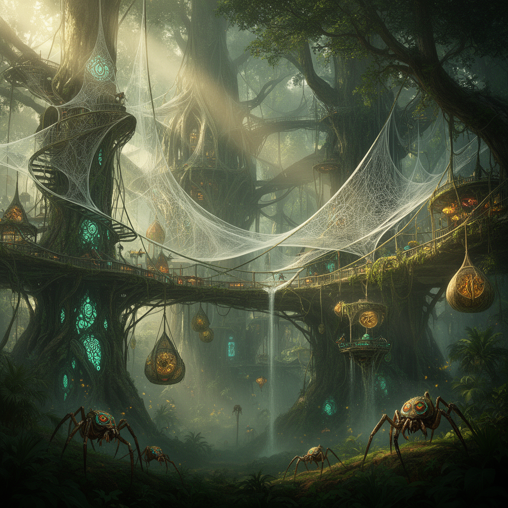 A breathtaking fantasy landscape showcases a spider civilization nestled within a vibrant, sun-drenched jungle. Intricate web structures and glowing architecture connect colossal trees, creating a mystical and awe-inspiring scene.