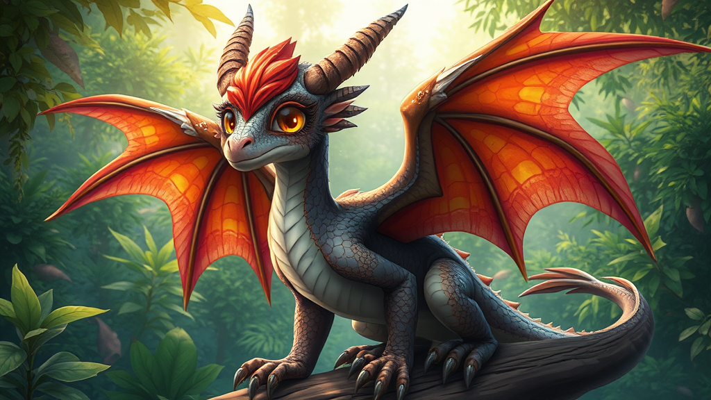 Fantasy style whimsical girl dragon perched in a verdant forest, enchanting youthful face, expansive dragon wings, background lush with vibrant foliage, magical essence, realistically detailed skin adorned with eagle feathers, falcon-like wings, sturdy lizard legs, raptor grace, majestic komodo posture, large expressive anime-inspired eyes, vibrant color palette, gentle topaz glimmer, intricately detailed atmosphere.