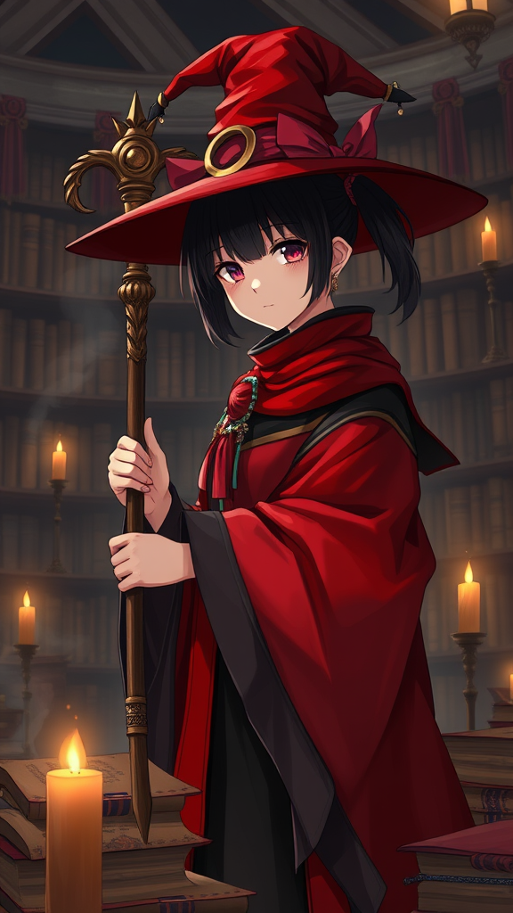 Fantasy-themed image featuring a single girl with very short black twintails, donning a red and black robe and Arabic-inspired attire. She wields a magic staff and is surrounded by mystical scrolls, a witch hat perched jauntily on her head. The scene is set in a dimly lit library, with flickering candlelight casting a warm glow. Captured in high resolution with 8k UHD and HDR quality, enhancing the vivid details of the magical atmosphere. Careful attention to avoid duplicate and mutated features or artifacts, ensuring a clear, focused composition without distractions like watermarks, logos, or text.