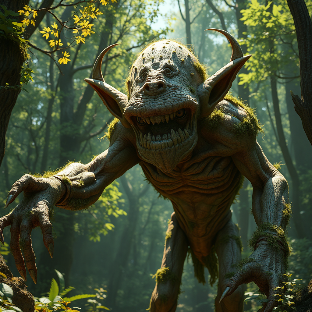 Fantasy troll, ultra-realistic, rendered with cinematic quality using octane and unreal engine, exceptionally detailed textures, vibrant HDR colors, towering figure amidst lush forest backdrop, intricate facial features with deep-set eyes, moss-covered skin with visible pores, elongated limbs, ethereal glow under dappled sunlight, atmosphere of mystical enchantment, aspect ratio 9:16.