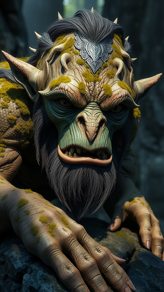 Fantasy troll, hyper-realistic, 8K resolution, octane render, unreal engine, intricately detailed, hdr lighting, exaggerated features, moss-covered skin, atmospheric environment, shadows playing on rugged terrain, artistically imagined imperfections, immersive realism, vivid natural colors.