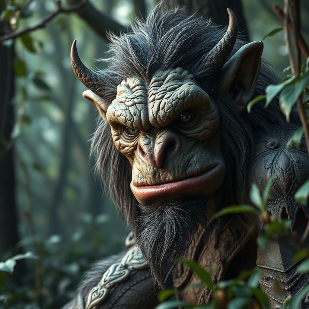Fantasy troll in a lush forest setting, hyper-realistic texture and lighting, rendered using advanced techniques, intricate details showcasing rugged skin and earthy tones, reflective eyes, capturing the essence of mysticism, composed with cinematic depth and vibrant color, resembling a scene from an epic adventure.