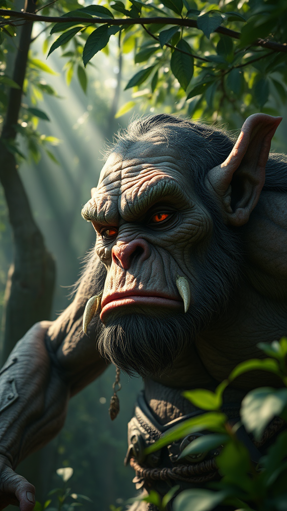 Fantasy troll in a mystical forest, depicted in a photorealistic style with the incredible detail and vivid colors of an octane render, utilizing the powerful capabilities of the unreal engine. The troll's skin is textured with hyper-detailed wrinkles and earthy tones, reflecting a life intertwined with nature. Light filters dramatically through the lush foliage above, casting intricate shadows that highlight the troll's rough, stone-like features. Despite its imposing presence, there is an unexpected touch of whimsy in its eyes, suggesting a misunderstood creature in this enchanted setting, all captured with HDR quality and executed with an intentionally unrefined artistic charm.