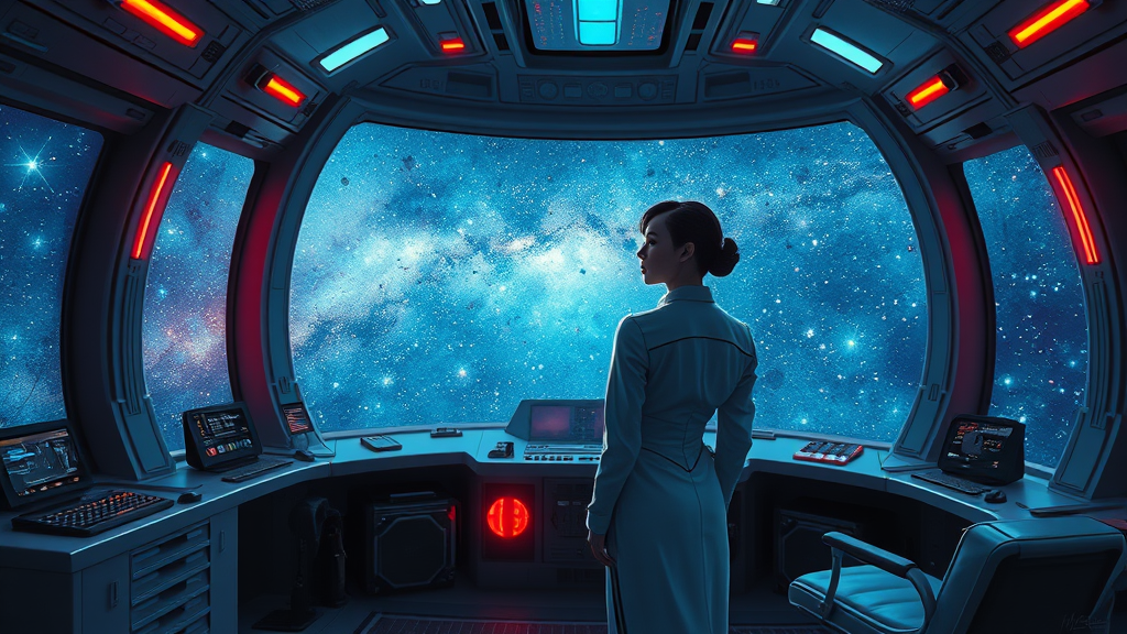 Far view wide angle shot of a solitary astronaut girl in an elegant uniform, standing inside the spaceship command room, gazing out at the sprawling galaxy. The scene is bathed in a sci-fi neon light, casting a fantasy aura over the sophisticated interior. The digital painting captures the intricate details and beauty of the setting, drawing inspiration from the artistry of Tian Zi, WLOP, and Alphonse Mucha. The composition is smooth with sharp focus, creating a stunning illustration reminiscent of concept art found on ArtStation. The room is adorned with high-tech equipment, and the starlit view outside transports the viewer into a mesmerizing realm of exploration and wonder.