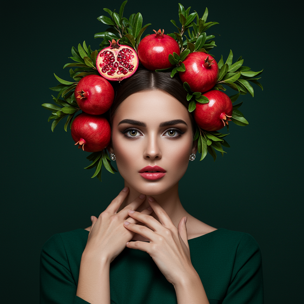 Fashion cover, front view, full-body, a stunning girl with mesmerizing dark eyes, dressed in an elegant emerald gown, adorned with a crown made of lush pomegranates and delicate green leaves, exuding a sense of regal natural beauty.