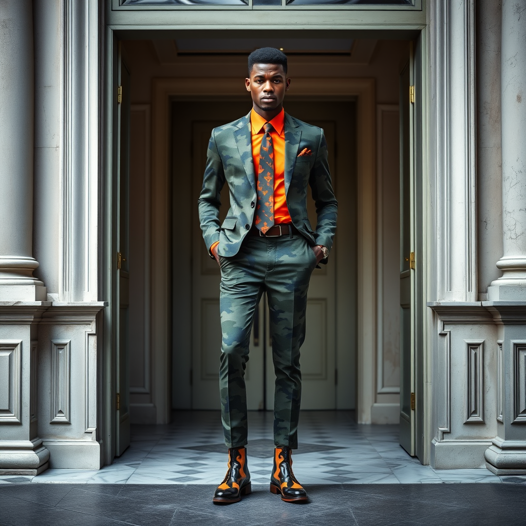 Fashion cover showing a stylish man in a chic camouflage suit standing at an elegant doorway. He wears an eye-catching orange shirt paired with a matching camouflage tie. His look is completed with trendy camouflage-patterned boots. The composition is graceful and modern, capturing the essence of bold yet sophisticated style. The backdrop emphasizes the model's attire, accentuating the unique blend of colors and textures in a full-body front view portrait.