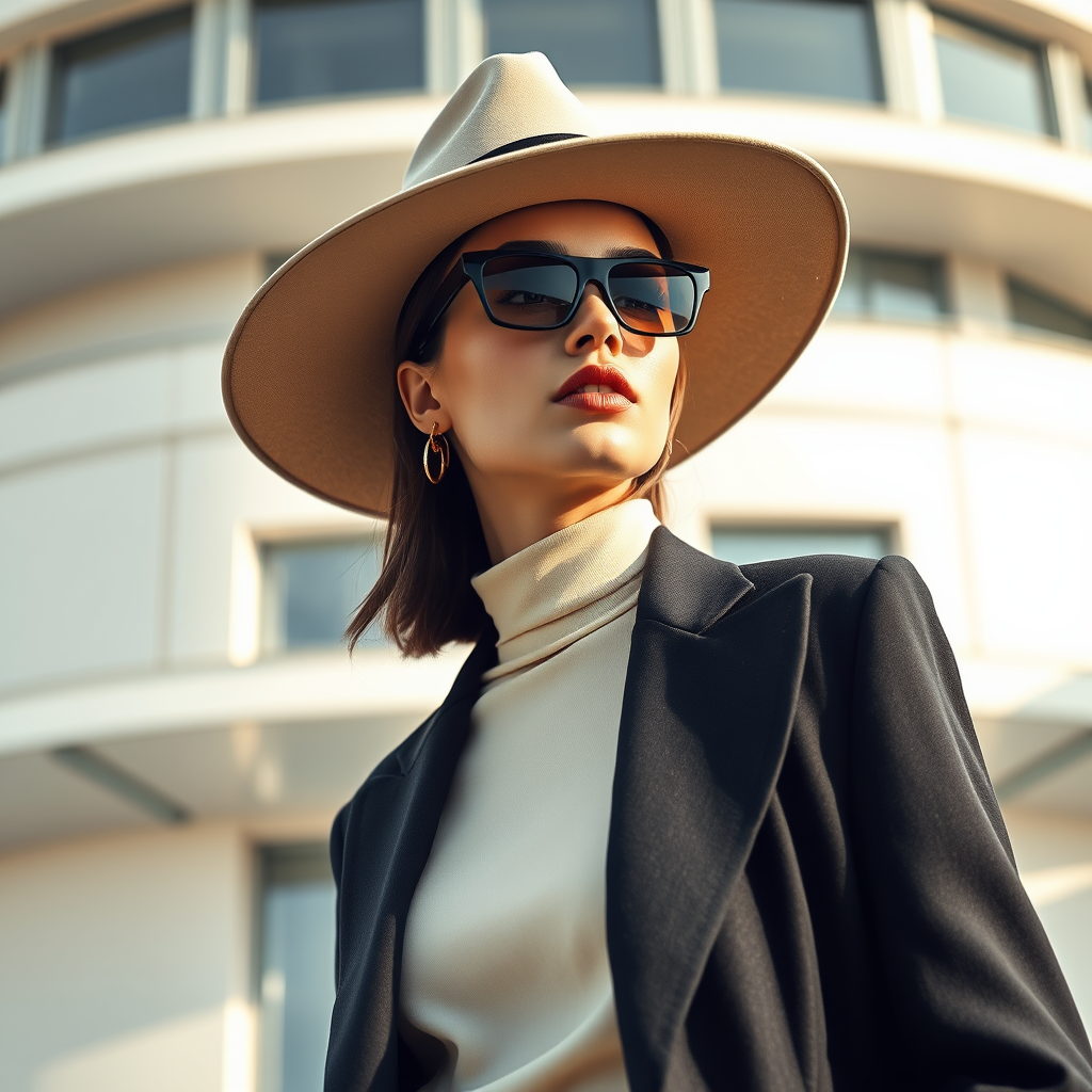 Fashion design featuring a female model wearing elegant minimalist women's clothing, adorned with a statement oversized hat and stylish designer sunglasses, set against the backdrop of a modern Bauhaus building. The scene is captured with bright yet gentle lighting, emitting a sleek and sophisticated high-end ambiance. The composition emphasizes fine lines and intricate details, showcasing realistic anatomy and exuding a sense of refined elegance. Shot with a high-resolution camera, capturing every nuance with an editorial-style focus.