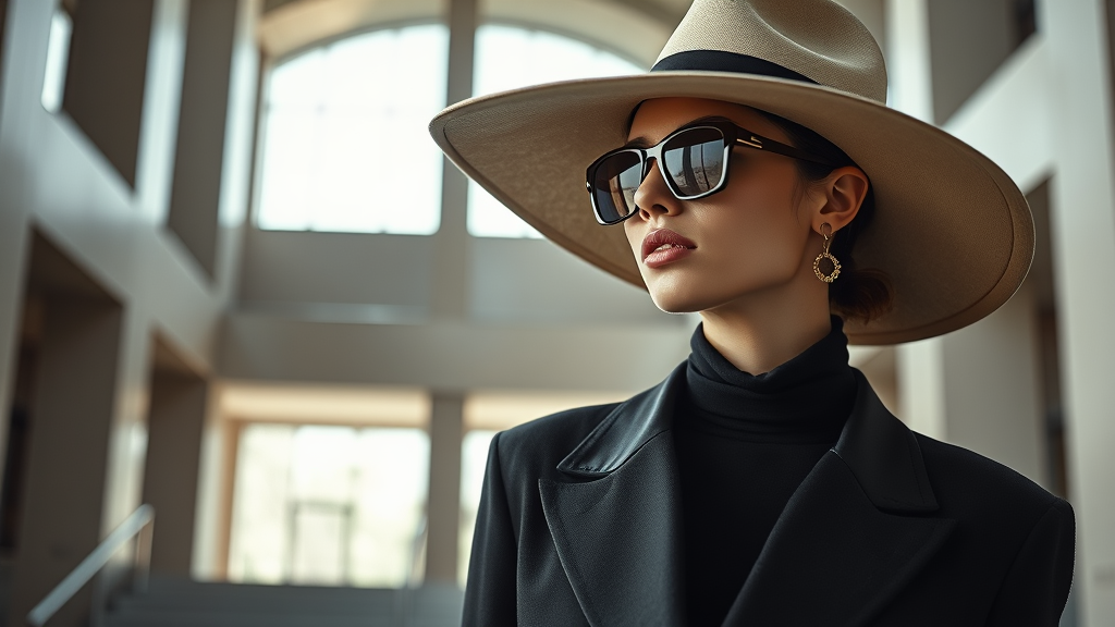 Fashion design scene highlighting a female model in minimalist women's attire, donning an oversized hat and high-end sunglasses, captured in an iconic Bauhaus building setting with bright, soft lighting, exuding a sleek, sophisticated style with an air of luxury, emphasizing clean lines and intricate details, featuring realistic anatomy, shot with a Nikon D800. Consider subtle creative alterations to the ensemble's texture, introducing a hint of modern metallic accents, while preserving the essence of minimalist elegance.