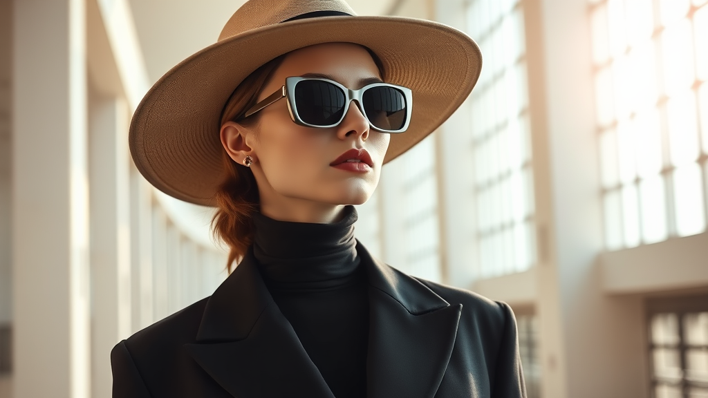 Fashion design work highlighting a female model dressed in minimalist women's apparel, adorned with an oversized hat and Dior sunglasses, captured in a Bauhaus-style building with a play of bright and gentle lighting; the scene exudes a minimalist and sleek aesthetic, conveying sophistication and luxury, showcasing delicate lines and fine details, with realistic anatomies, shot using a Canon EOS-1D X.