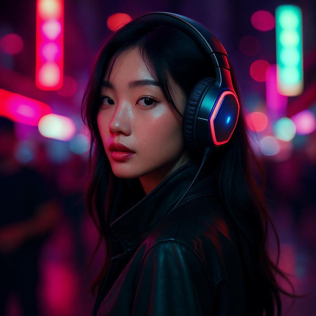 View this AI-generated image featuring fashion editorial featuring a stunning black haired asian woman adorned in sleek avant garde headphones illuminated by vibrant pink and teal neon lights in a bustling nightlife setting captured in high resolution with a cinematic flair professional photography