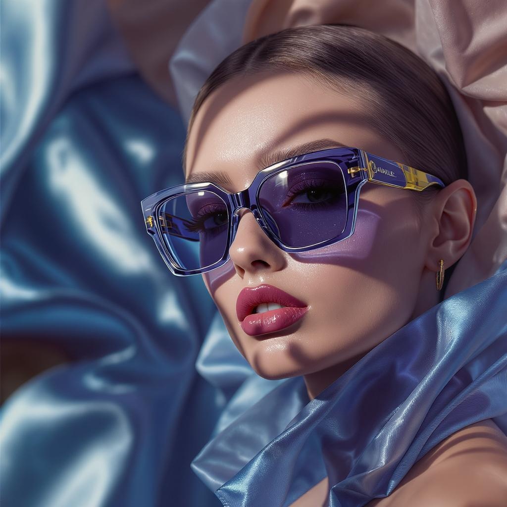Fashion editorial featuring a collaboration between Jacquemus and Moncler: sleek dark blue translucent sunglasses with a futuristic twist, captured in hyper-realistic detail at 8k resolution, vibrant and true-to-life. The scene displays these avant-garde accessories in a dreamy, ethereal atmosphere, with a stylized aesthetic that enhances their modern allure. The portrait aspect ratio of 2:3 highlights the boldness and innovation, while slight creative touches infuse the visual with a sense of high-fashion elegance and sophistication.