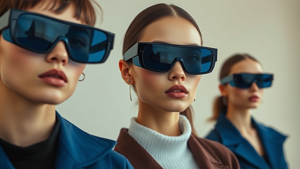 Fashion editorial featuring a Jacquemus and Moncler collaboration: sleek dark blue translucent futuristic sunglasses, hyper-realistic detail captured in 8k. The setting evokes a chic, modern vibe with refined elegance, set against a backdrop of soft muted tones that highlight the bold accessories. Models showcase avant-garde and minimalist clothing with subtle textures and layered fabrics, emphasizing the innovative design. The composition is artfully balanced, merging high fashion sensibilities with an avant-garde edge, offering a captivating narrative in an elongated 2:3 aspect ratio, infused with a stylistic sophistication of 750 smooth transitions in scene.