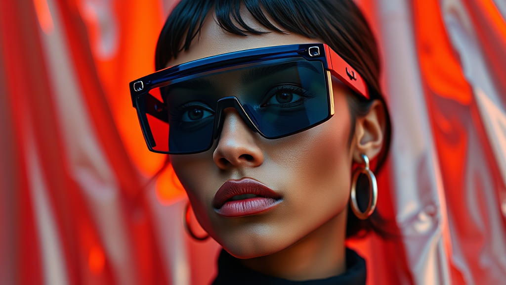 Fashion editorial featuring a Jacquemus and Moncler collaboration: dark navy translucent futuristic eyewear, ultra-realistic, highly detailed 8k, lifelike atmosphere, set against a vibrant backdrop with subtle metallic accents --ar 2:3 --s 750.