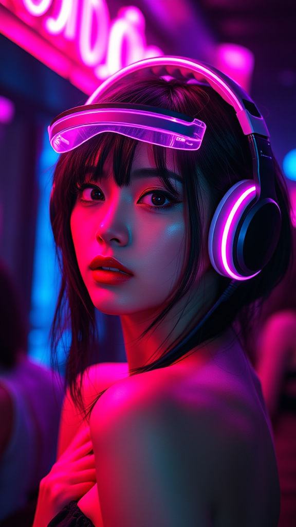 Fashion editorial featuring a stunning black-haired Asian woman wearing futuristic abstract headphones, illuminated by vibrant pink and blue neon lights in a trendy nightclub setting, high-resolution realistic photography captures her in a striking cinematic angle, with dynamic backlighting creating a captivating and dramatic visual effect.