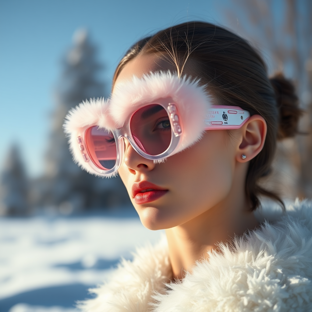 Fashion editorial highlighting a Jacquemus and Moncler collaboration: showcasing ethereal light pink translucent fur sunglasses, hyper-realistic details captured in ultra-high-definition 8k, set against a serene winter landscape, exuding luxury and futuristic elegance with a soft, diffused glow enveloping the scene.