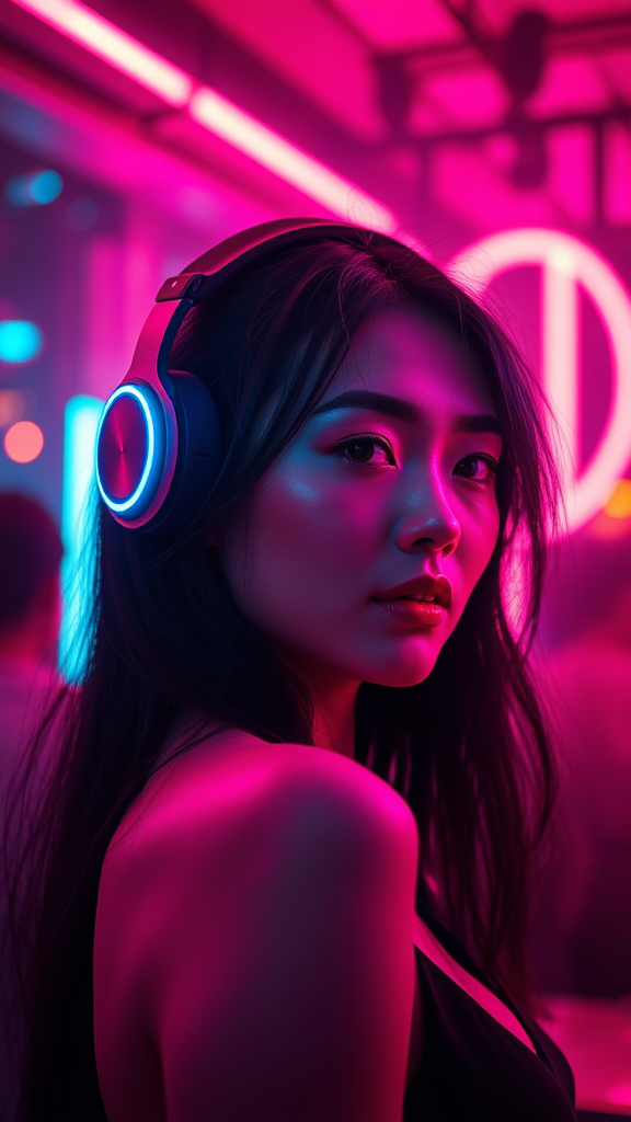 Fashion editorial of a stunning black-haired Asian woman wearing futuristic headphones, enveloped in the glow of vibrant pink and blue neon lights, set against the pulsating atmosphere of a nightclub. Captured in high-resolution with meticulous attention to realistic details, this professional photograph showcases a cinematic angle with dynamic backlighting that highlights her silhouette, infusing the scene with an electrifying energy.