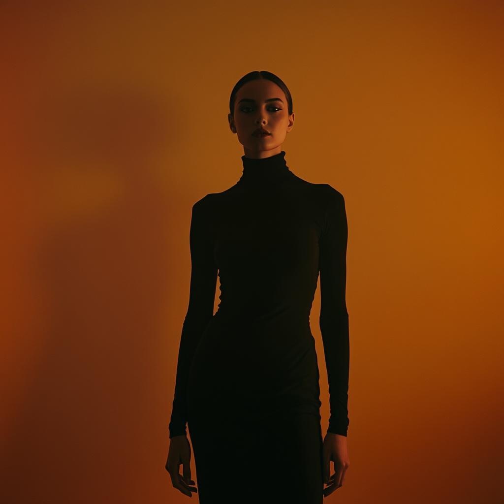 Fashion editorial photography front shot upper body professional female model taken with Hasselblad X2D 100C XCD 90mm f/2.5 lens cinematic sepia color grading with golden hour warmth dramatic black silhouette against a gradient backdrop shifting from burnt umber to honey amber avant-garde composition featuring a tilted head pose with a profound gaze directed towards the camera elongated body stance adorned in a flowing black turtleneck main fresnel light positioned at a 60-degree angle with silk diffusion rim light using CTO gel at a 75-degree angle creating an ethereal atmosphere with haze machine feathered shadows with contrast curve manipulation selective dodge and burn techniques applied grain texture overlay with color temperature adjustment from 5500K to 3200K gradient capturing ultra-sharp details in raw format inspired by Paolo Roversi's lighting technique hyper-realistic rich detail rendered at 16K featuring small creative modifications while maintaining core concept