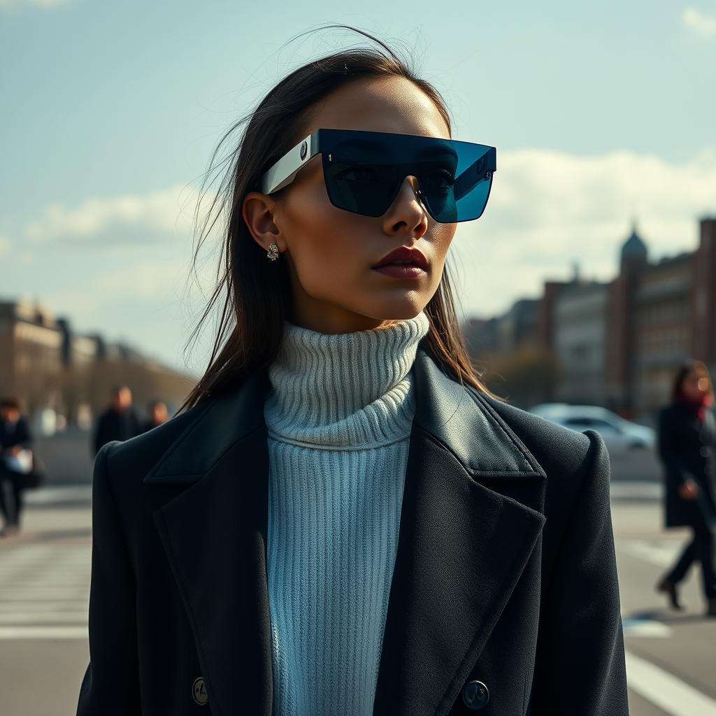 Fashion editorial photography featuring a collaboration between Jacquemus and Moncler: deep navy translucent futuristic eyewear, hyper-realistic, highly detailed in 8k resolution, lifelike atmosphere with a sleek, modern aesthetic, set against a dramatic urban landscape, emphasizing crisp textures and subtle reflections.