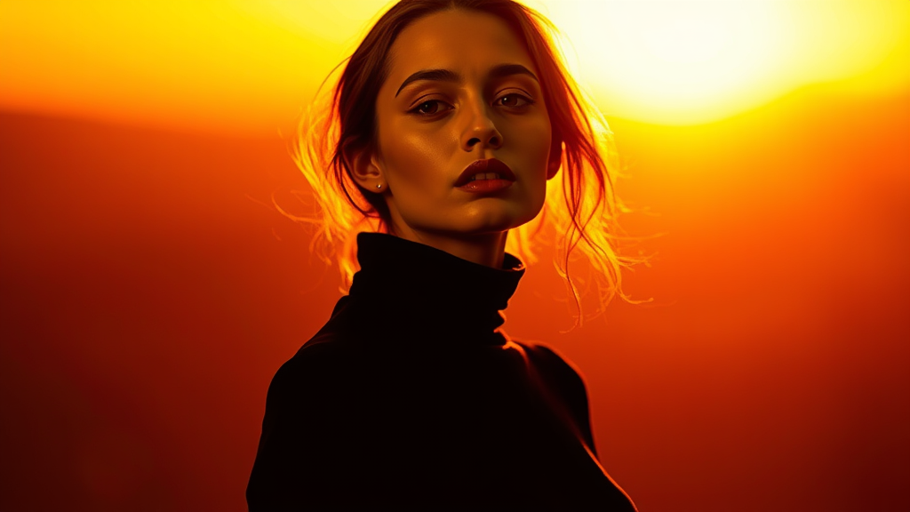 Fashion editorial photography front shot upper body professional female model shot with hasselblad x2d 100c xcd 90mm f/2.5 lens cinematic sepia color grading golden hour glow dramatic silhouette against deep umber to amber gradient background avant-garde composition head tilted gaze locked on camera intense expression elongated stance wearing flowing black turtleneck main fresnel light at 60-degree angle with silk diffusion rim light using cto gel at a 75-degree angle ethereal atmosphere created with haze machine feathered shadows enhanced contrast curve selective dodge and burn grain texture overlay adjusted color temperature from 5500k to 3200k enhanced sharpness captured in raw format inspired by paolo roversi lighting technique hyper-realistic 16K vibrant detail --ar 9:16 --quality 2 --style raw --maintain personalized elements nq7rq2j --stylize 500 --v 6.1