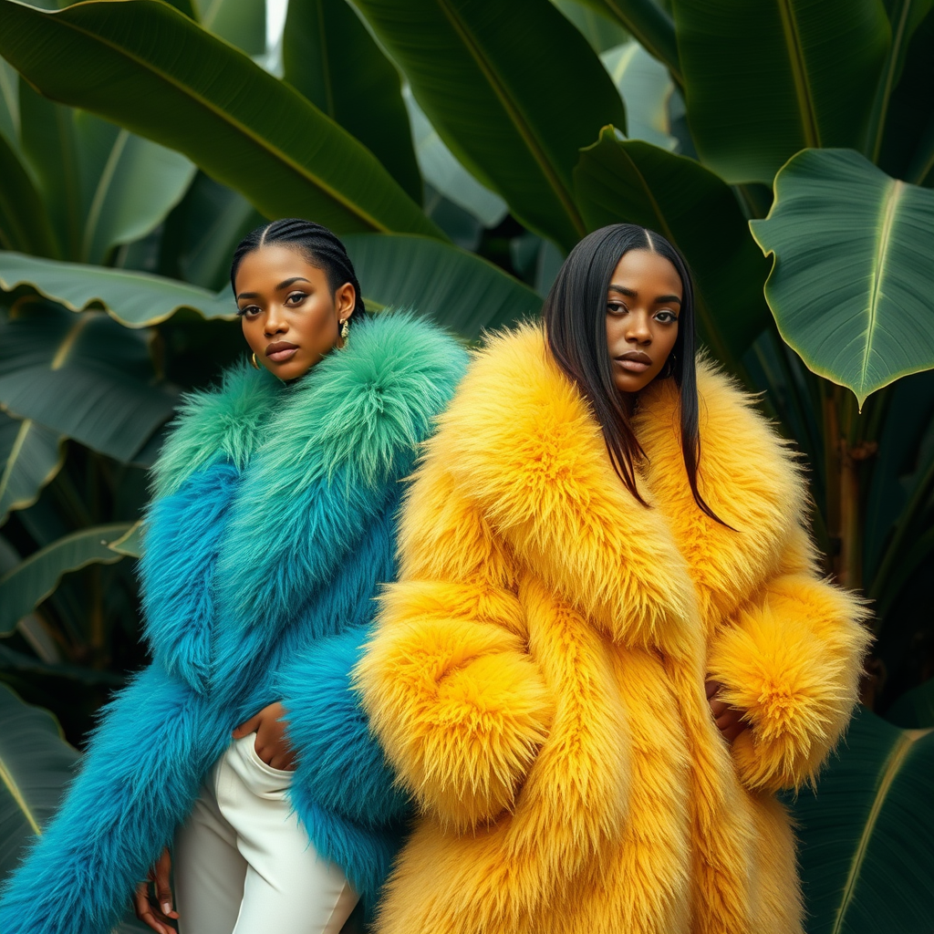 Fashion editorial photoshoot featuring two diverse models, each adorned in opulent yellow and azure fur coats, set against the lush backdrop of a sprawling banana leaf plantation. Captured through the lens of a top-tier professional photographer, this imagery showcases hyper-realistic detail and exquisite brand positioning in ultra-high resolution, evoking a captivating blend of luxury and nature with a 4:5 aspect ratio and exceptional quality.
