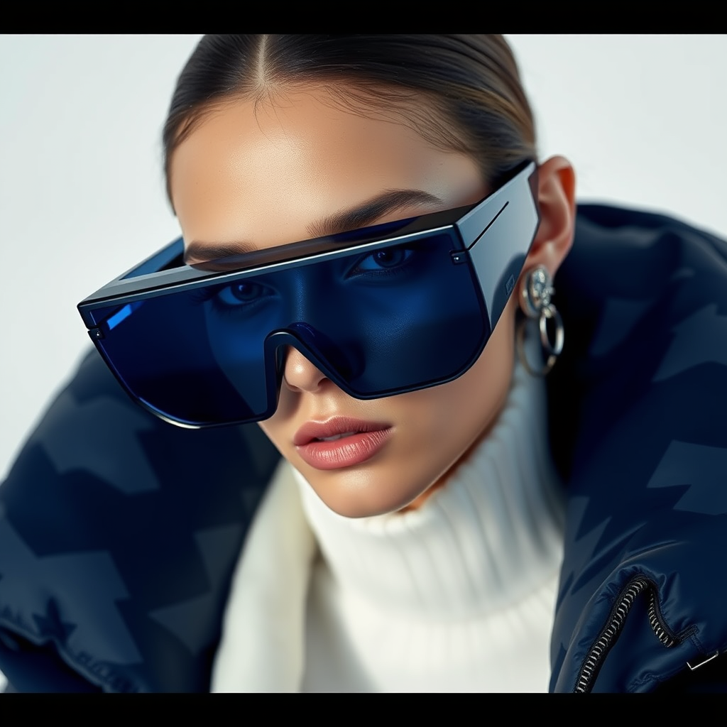 Fashion editorial showcasing a Jacquemus and Moncler collaboration: sleek dark blue translucent futuristic sunglasses, ultra-realistic, stunning detail in 8k resolution, capturing the essence of innovation and style --aspect ratio 2:3 --stylized 750 --version 6 with subtle artistic enhancements to emphasize the harmony between advanced fashion aesthetics and avant-garde design.