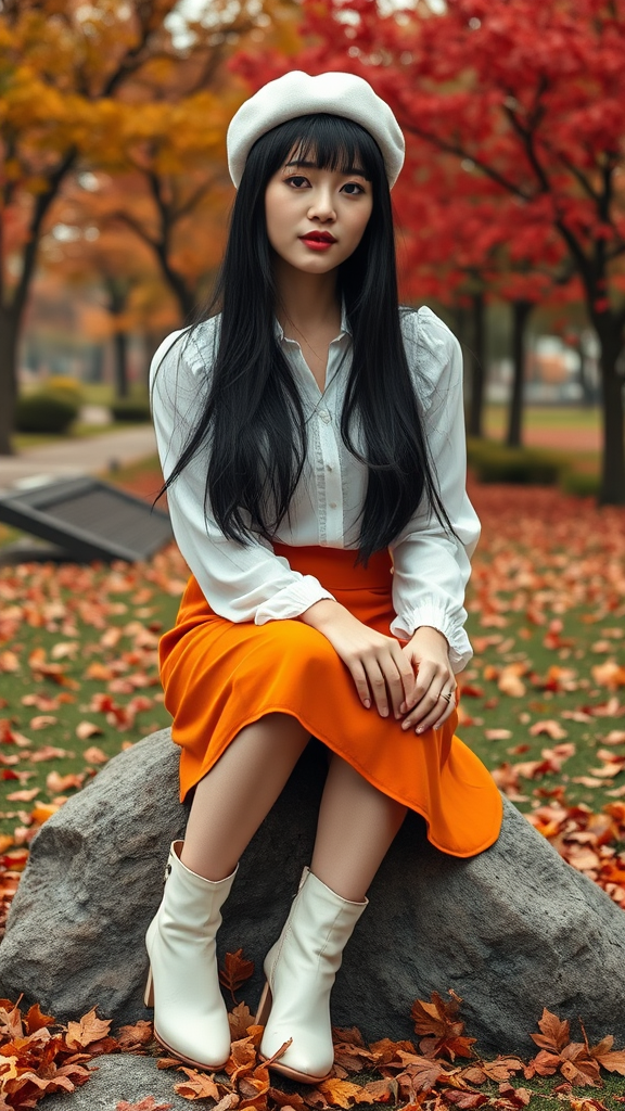 Fashion editorial style captivating Asian woman with long silky black hair and chic bangs, deep expressive eyes, and naturally full lips adorned with subtle makeup. She dons an exquisitely detailed white blouse paired with a stylish white beret and a chic burnt-orange skirt. Her look is completed with sleek white boots. She is gracefully seated on a large rock within a vibrant park, surrounded by the rich hues of autumn as leaves blanket the ground. It's an overcast, somber day, adding depth as the scene is artfully captured in a high fashion, trendy, and magazine-worthy manner. The setting is professional and highly detailed, exuding a modern yet timeless elegance.