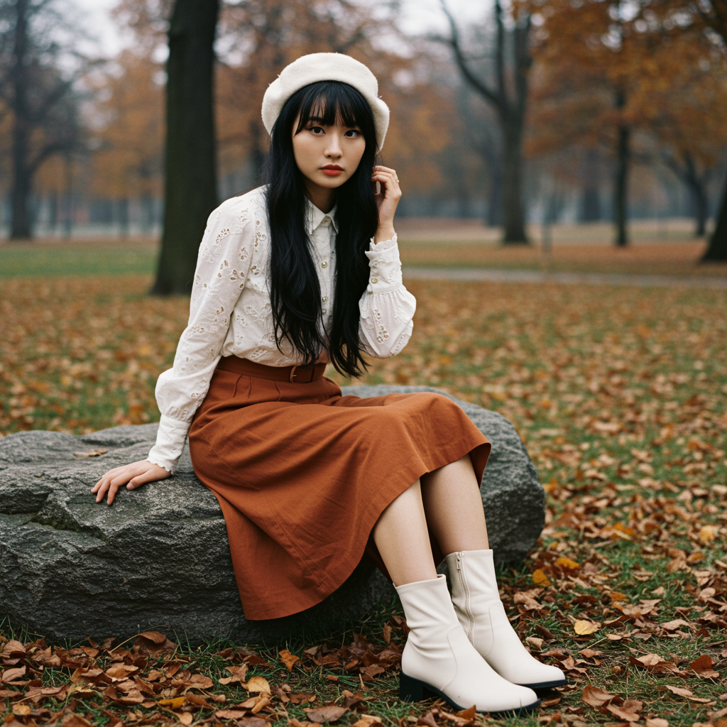 Fashion editorial style featuring a stunning Asian woman with long black hair and bangs, dark captivating eyes, and full lips, adorned with subtle makeup. She is elegantly dressed in an intricately detailed white blouse paired with a chic white beret, a vibrant burnt-orange skirt, and stylish white boots. She sits gracefully on a large rock amidst a park alive with vivid autumn hues, the ground blanketed in colorful leaves. The atmosphere is moody with an overcast sky, enhancing the depth of field. The shoot captures the essence of high fashion, exuding a trendy, stylish, and professional magazine-quality vibe, with a slight nostalgic touch that adds artistic flair and uniqueness.