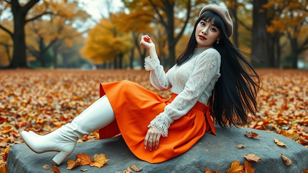 Fashion editorial style portrait of a stunning Asian woman with flowing black hair and chic bangs, her dark eyes captivating and full lips slightly parted, adorned in subtle makeup. She wears an intricately detailed white blouse paired with a stylish beret hat and a burnt-orange skirt, accentuated by elegant white boots. Seated gracefully on a large rock, she is surrounded by a vibrant park setting with the ground richly carpeted in autumn leaves. The day is overcast, casting a soft diffused light over the scene. She exudes high fashion allure, perfectly captured in a trendy, editorial magazine style that is professional and highly detailed, showcasing the vivid textures and colors of fall.