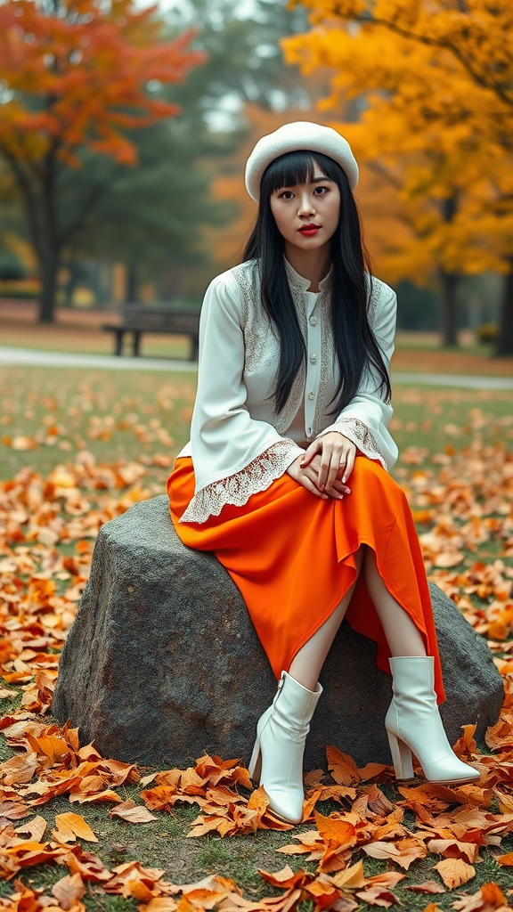 Fashion editorial style stunning Asian woman with sleek, long black hair and chic bangs, captivating dark eyes, and naturally full lips highlighted with subtle makeup. She wears an ornately detailed white blouse paired with a stylish white beret hat and a vibrant burnt-orange skirt. Completing the look with elegant white boots, she sits gracefully on a large rock amidst a picturesque park. Surrounded by vivid autumn foliage and a blanket of fallen leaves, the scene is set on an overcast day with a soft depth of field. The atmosphere conveys high fashion, trendiness, and polished style, capturing a professional, magazine-worthy quality.