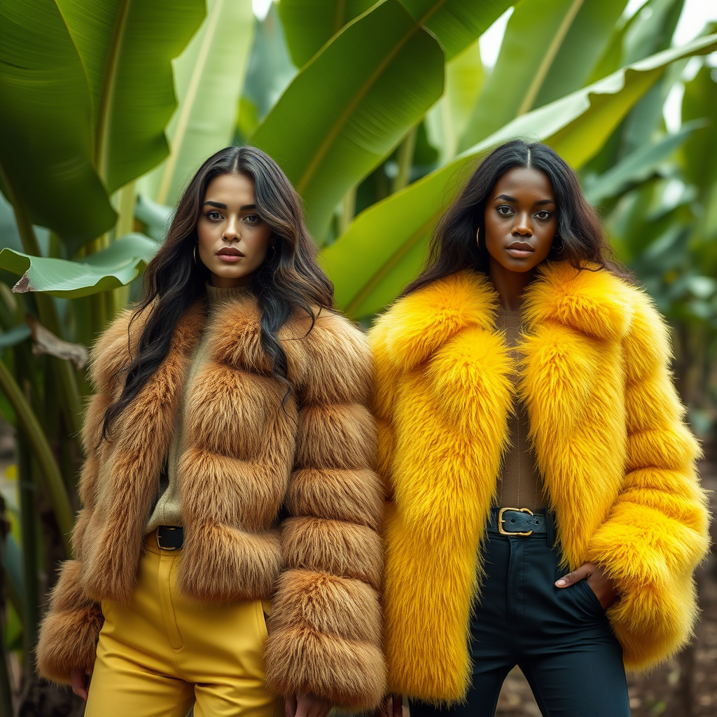 Fashion editorial, two female models, vibrant yellow and deep blue fur jackets, lush banana plantation, expert photography, ultra-high resolution, designer label, hyper-realistic, 8k quality, capturing the essence of luxury amidst nature.