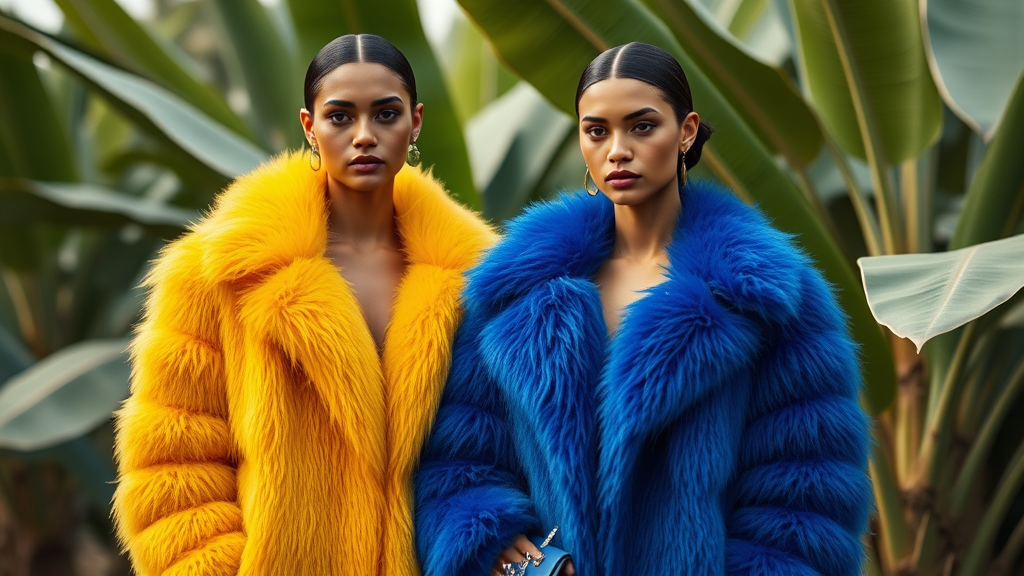Fashion editorial, two female models, vibrant yellow and royal blue faux fur coats, set against a lush banana plantation backdrop, expertly captured in stunning detail, luxury brand essence, hyper-realistic imagery, ultra-high definition, cinematic quality, 4:5 aspect ratio, elevation in color and style.