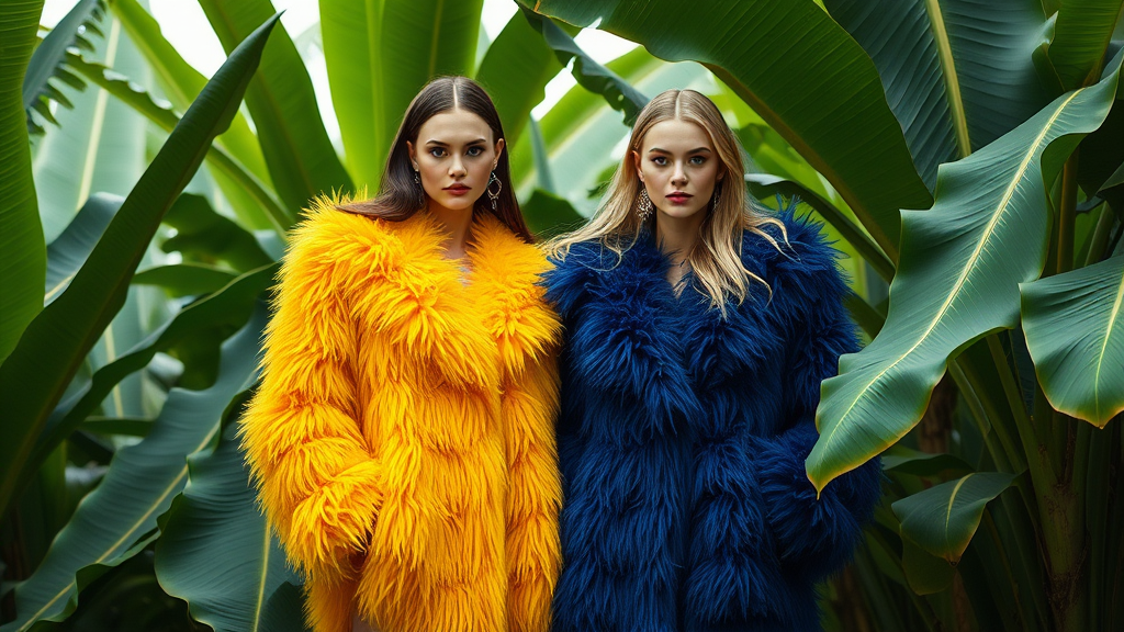 Fashion editorial: Two model girls in vibrant yellow and deep blue fur coats standing amidst a lush banana leaf plantation, captured by renowned photographers in stunning high resolution. The image showcases a luxury brand aesthetic, with a photorealistic style highlighted in meticulous 8k detail, maintaining an aspect ratio of 4:5, executed with a quality level that emphasizes texture and color contrast subtly accentuated by the natural backdrop.