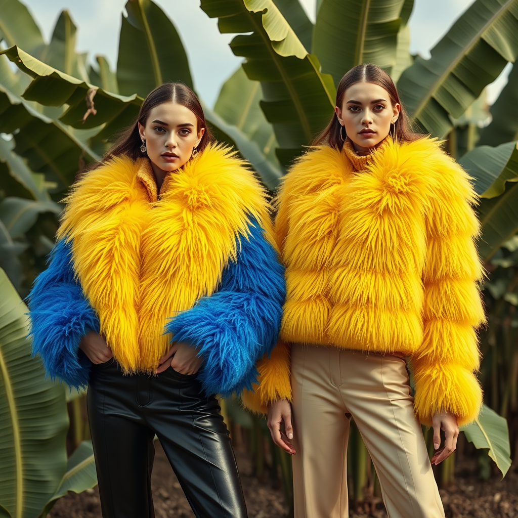 Fashion editorial, two model women, vibrant yellow and cobalt blue faux fur jackets, lush banana plant landscape, expert photography, ultra high definition, luxury brand aesthetic, hyper-realistic, 8k resolution, cinematic quality, --ar 4:5 --q 2