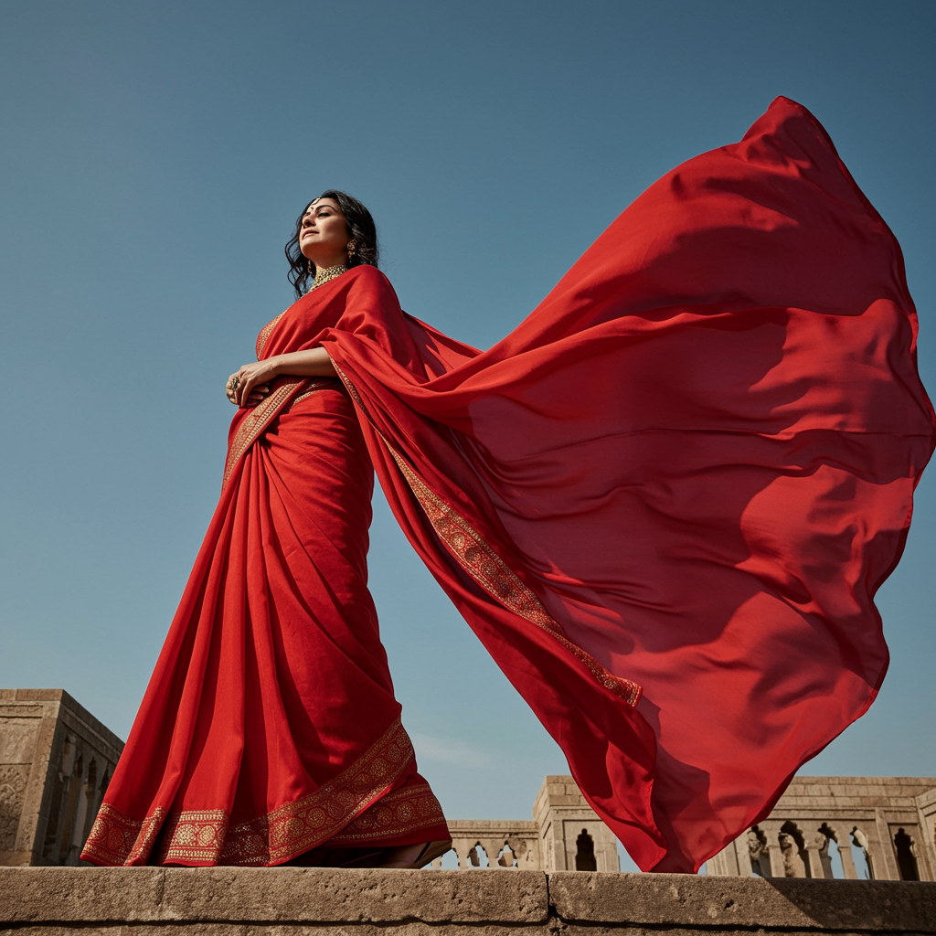 View this AI-generated image featuring fashion image capturing a striking 45 year old indian woman draped in a vibrant red traditional saree the fabric unfurling gracefully around her shot from an exceptionally low angle to provide a mesmerizing view it captures her full body from a side perspective