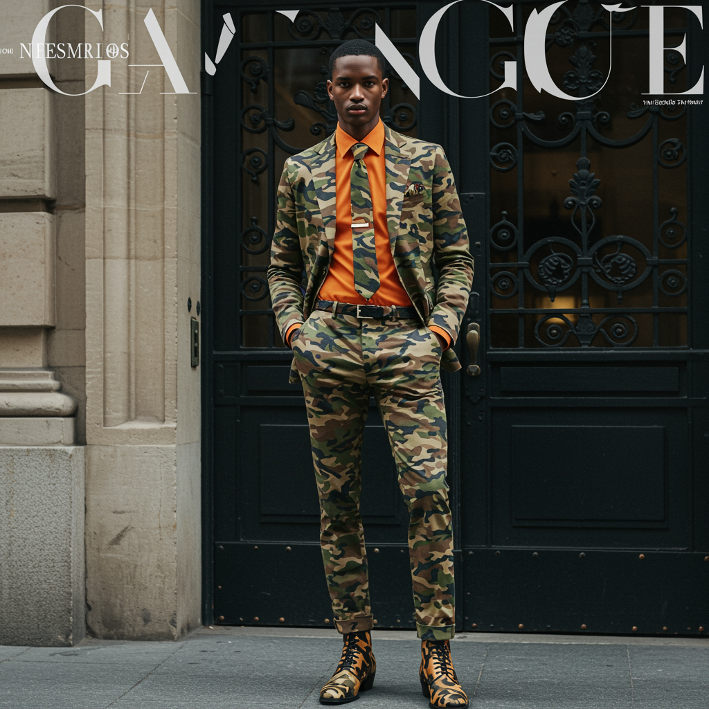 Fashion magazine cover showcasing a stylish front view of a male model standing confidently in front of an ornate door. He wears a sophisticated chic camouflage suit paired with a vibrant orange shirt and a matching camouflage tie, exuding a modern yet bold look. His ensemble is completed with eye-catching camouflage textured boots, adding an edgy touch, all set against a sleek urban backdrop, capturing the essence of contemporary elegance and power.