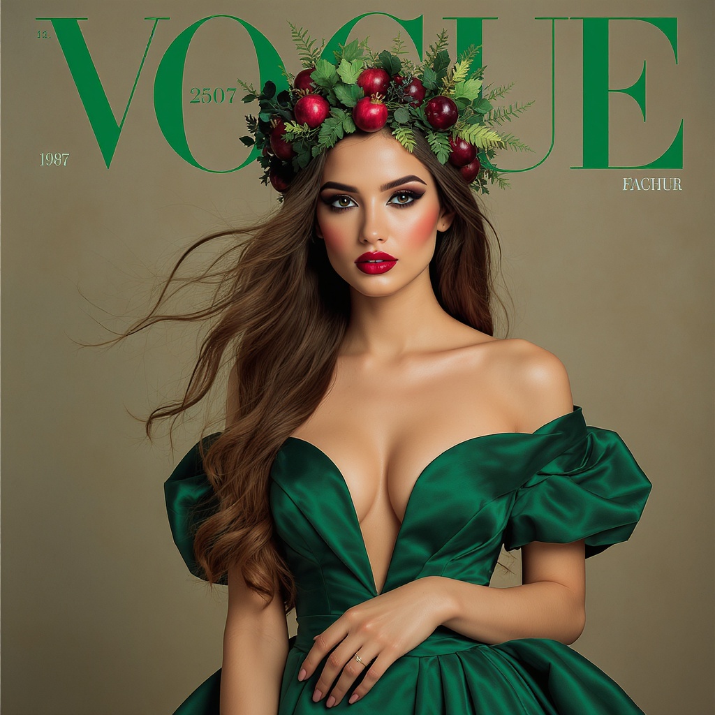 On the cover of a high-end fashion magazine, a stunning young woman with mesmerizing dark eyes stands confidently, dressed in an elegant emerald gown that drapes gracefully to the floor. Her head is adorned with a unique crown intricately crafted from lush green foliage interwoven with vibrant red pomegranates, adding a touch of natural opulence. Her long, flowing hair cascades down her back, highlighting her poised and regal stance as she gazes directly at the viewer, exuding an aura of enchantment and allure.