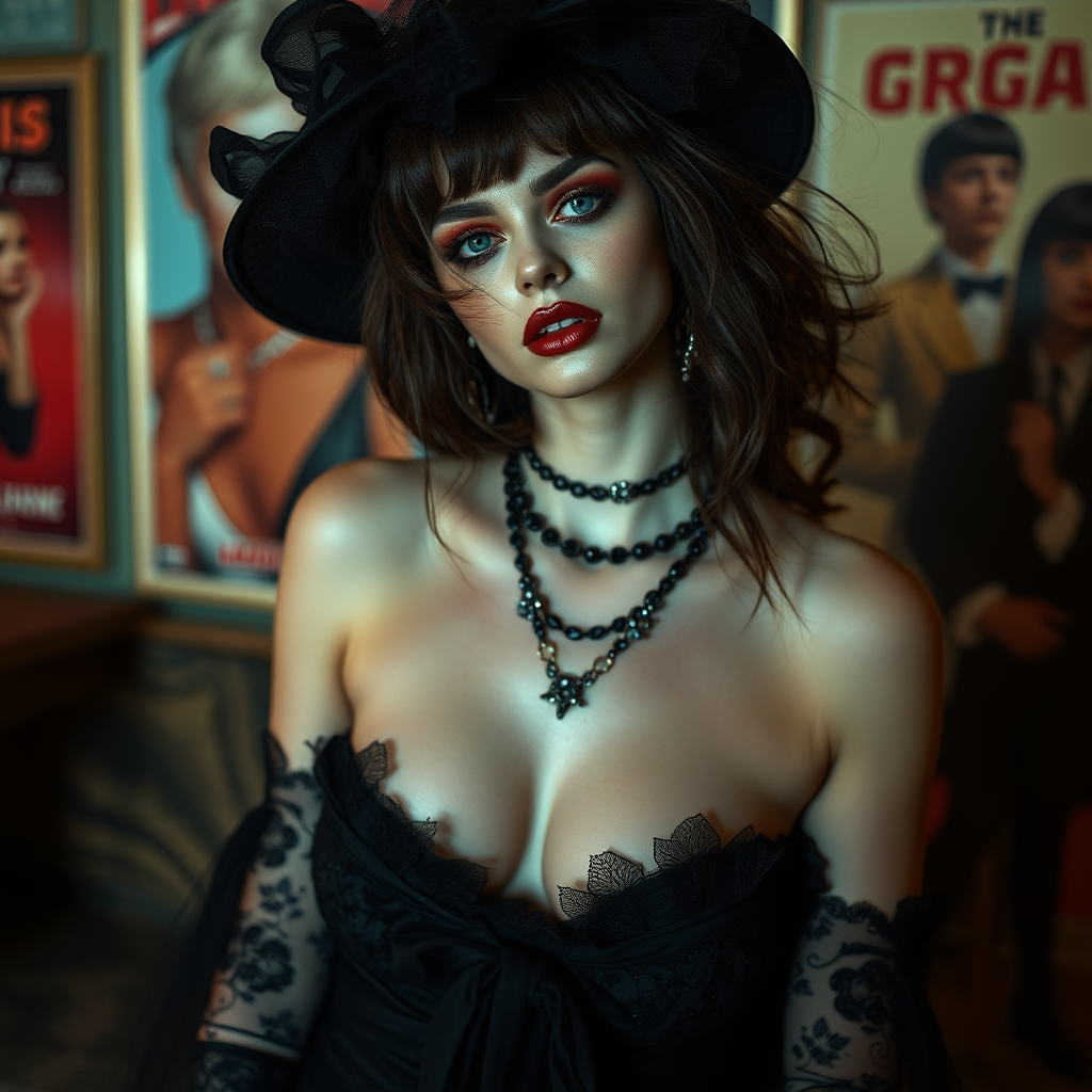 Fashion model photography hyper contemporary glamorous surreal creative exquisitely detailed reminiscent of cinematic posters vibrant emotional depth hermitpunk influence southern gothic aesthetic.