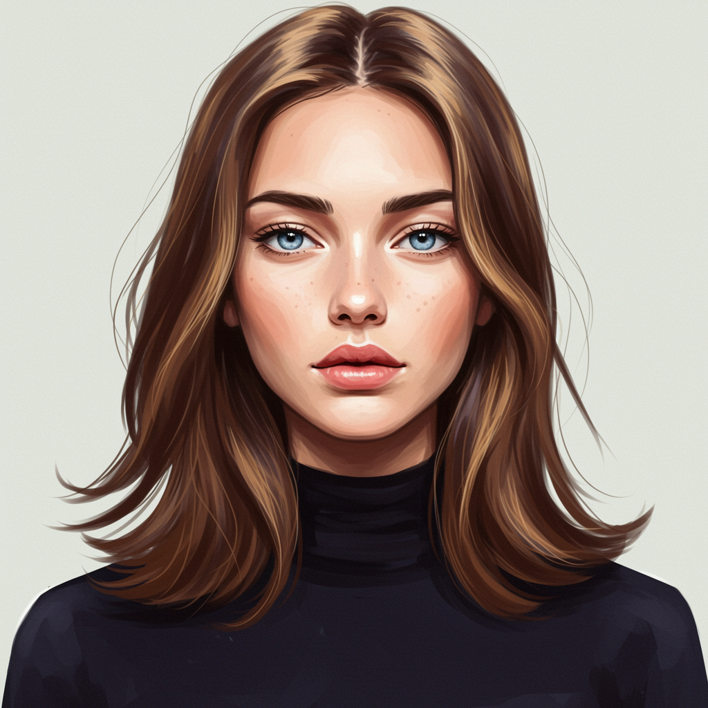 Fashion model standing, gazing directly at the viewer, captivating detailed eyes, exquisitely delicate face, gracefully floating, emphasis on facial features, paint by numbers style, subtle creative enhancements subtly woven into the portrait.