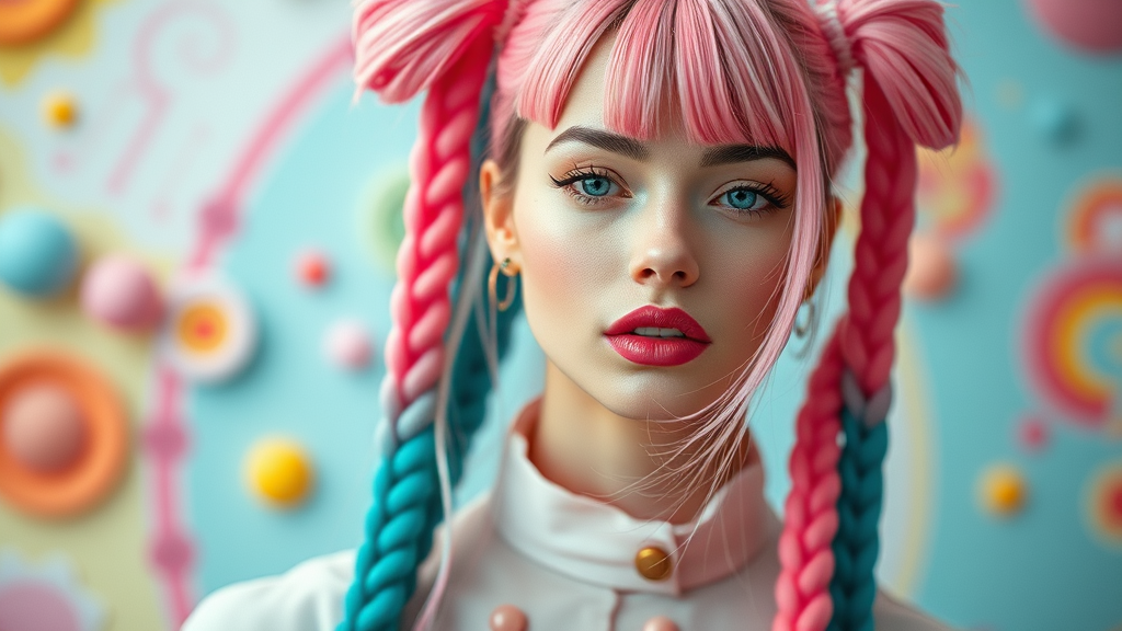 Fashion model with long, vibrant candycore-inspired pigtails, glowing pale complexion, soft blush pink lips, wearing avant-garde attire in pastel tones, set against a whimsical, colorful backdrop, exuding a playful and ethereal charm.