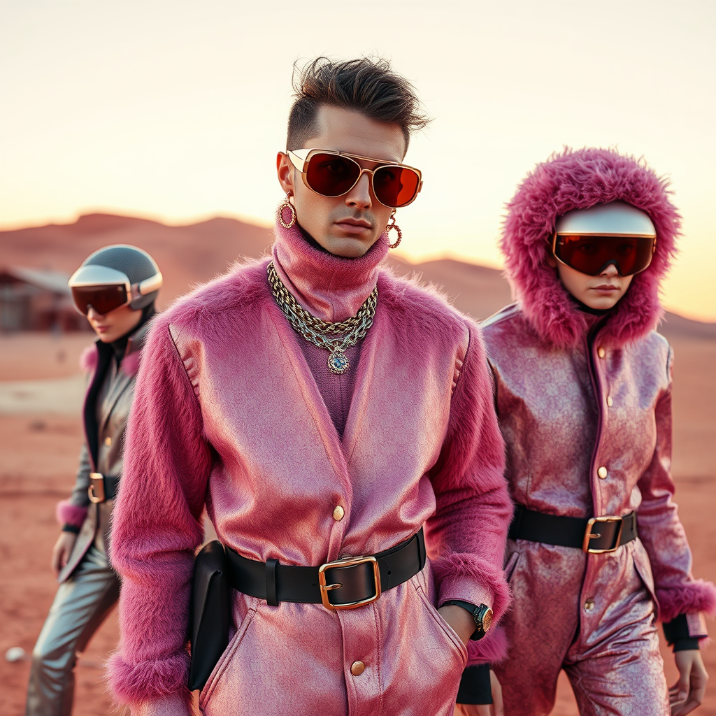 Fashion on Mars featuring Gucci-inspired street style, salmon and sky colors with a focus on character design. Elements of infrared photography blend with luminogram effects, wrapped in mokume gane textures, with hints of fluff and foil. The design incorporates a furry aesthetic with intricate girih patterns and molten textures. Tinsel accents combined with the brilliance of tourmaline and spinel create a rich tapestry. Infused with Danish pastel colors and shot with a 24mm lens, transitioning to a 100mm lens, resulting in ultra-clear 16k images. A dreamy glow and Bauhaus influence enhance the extraterrestrial theme, delivering hyper-detailed, fantastic realism with a touch of hyperrealism and kitsch flair in the outfits.