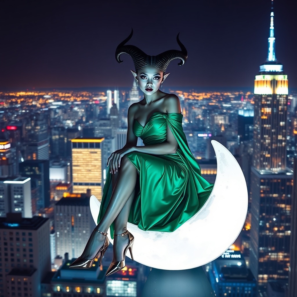 An ethereal fashion photo of a female alien with elegantly curved horns is set against the shimmering backdrop of the New York City skyline. She is seated gracefully on a crescent moon, draped in a striking emerald green gown complemented by metallic high heels, her eyes reflecting the twinkling city lights below.