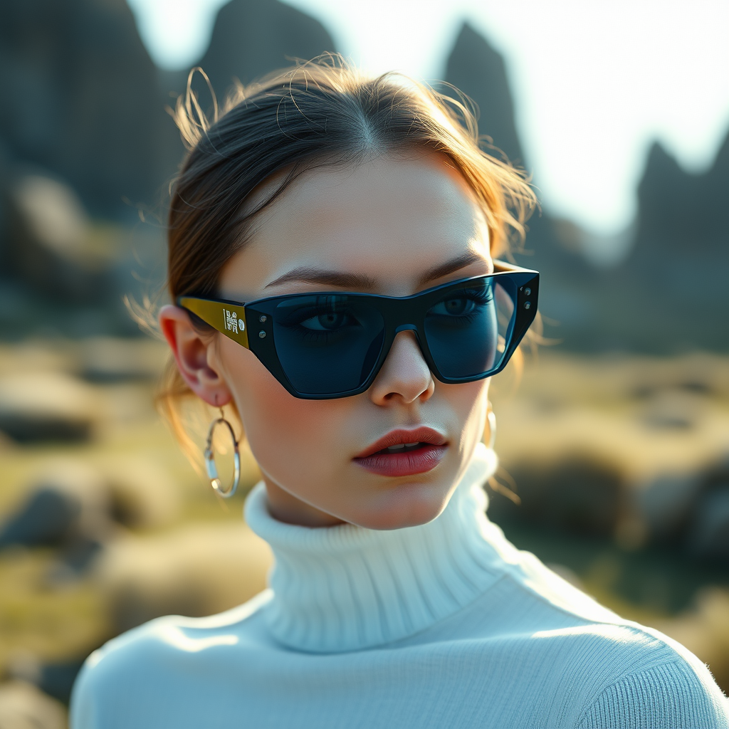 Fashion photo shoot featuring a collaboration between Jacquemus and Moncler: sleek, dark blue translucent sunglasses with a futuristic design, captured in hyper-realistic detail, 8k resolution. Model poses in an enchanting landscape with subtle, ethereal lighting that highlights the sunglasses' innovative elements, maintaining a balance between style and elegance --ar 2:3 --stylize 700 --v 6.