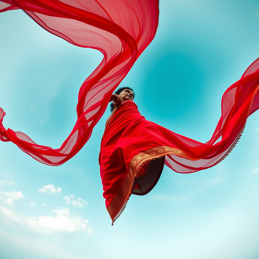 Fashion photograph capturing a "bug's-eye view" of an elegant 45-year-old Indian woman adorned in a flowing crimson Saree, gracefully swirling and billowing in all directions, fabric catching the wind for a dramatic visual spectacle. The composition is a full-body side profile, shot from a low vantage point, with the camera angled steeply upward. Her graceful silhouette is highlighted against the sky, her head framed within the shot, exuding confidence and poise in this captivating upward-angle shot.