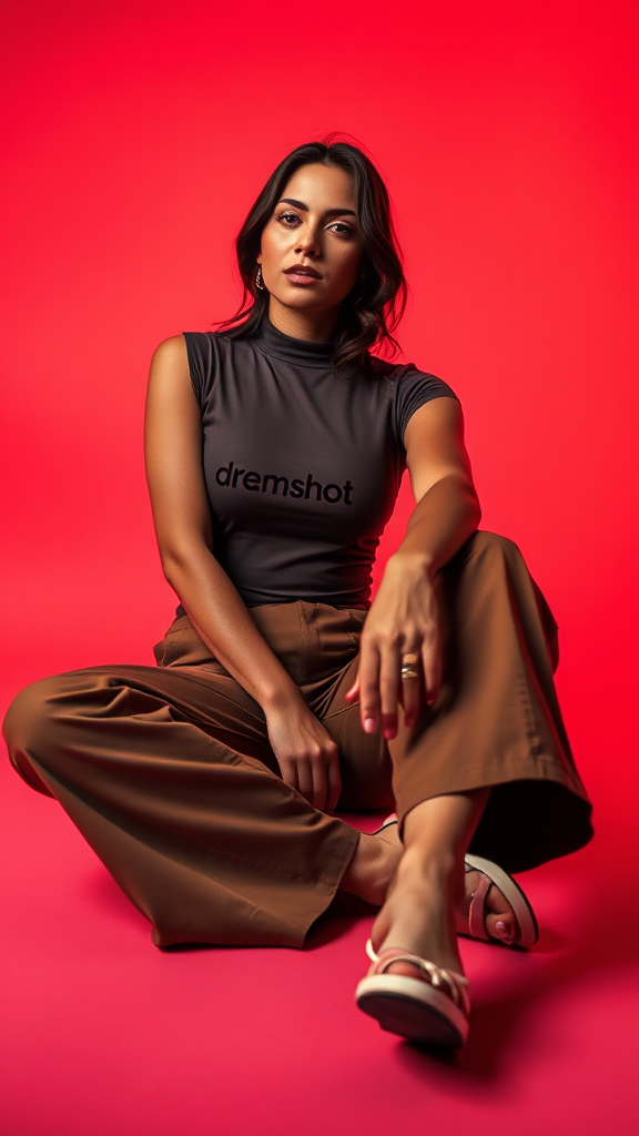 A cinematic fashion photograph featuring a woman seated gracefully on the floor, captured from a wide and low angle to emphasize the elegance of the scene. She wears a sleek Dreamshot heattech top, prominently displaying a bold "Dreamshot" logo, paired with stylish brown chinos. The backdrop is a smooth gradient of vivid red, soft pink, and warm orange hues, creating a captivating studio ambiance. Her pose exudes confidence and modern flair, while subtle shadows add depth to the vibrant composition.