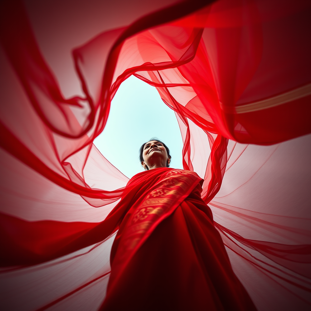 Fashion photograph inspired by a bug’s-eye view showcasing a stunning 45-year-old Indian woman draped in a flowing, vibrant red traditional Saree. The fabric dramatically swirls around her, creating an awe-inspiring and visually arresting scene. Captured in a full body shot, the image is taken from a low perspective at a steep upward angle, with the camera gazing skyward from the floor. The scene frames her head and sari as the centerpiece, with the elegant folds of the fabric accentuating the movement, adding a sense of grace and majesty from this extreme vantage point. Subtle touches of gold embroidery on the Saree enhance the overall splendor, glinting in the light to add depth and texture, as the dynamic pose emphasizes her poise and timeless beauty.