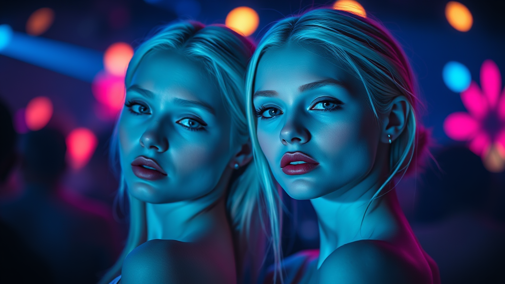 Fashion photography capturing a close-up portrait of two albino twin sisters under a mystical blue light setting, evoking the ambiance of a nighttime club. The scene features volumetric lighting that creates a cinematic and glamourous vibe. The dynamic light casts a backlit glow that enhances their ethereal appearance. The image is a high-resolution, realistic shot taken from a professional photography perspective, utilizing a cinematic angle to add depth. The twins are framed against a soft, vibrant bokeh background, enhancing the overall dreamlike and captivating quality of the portrait.